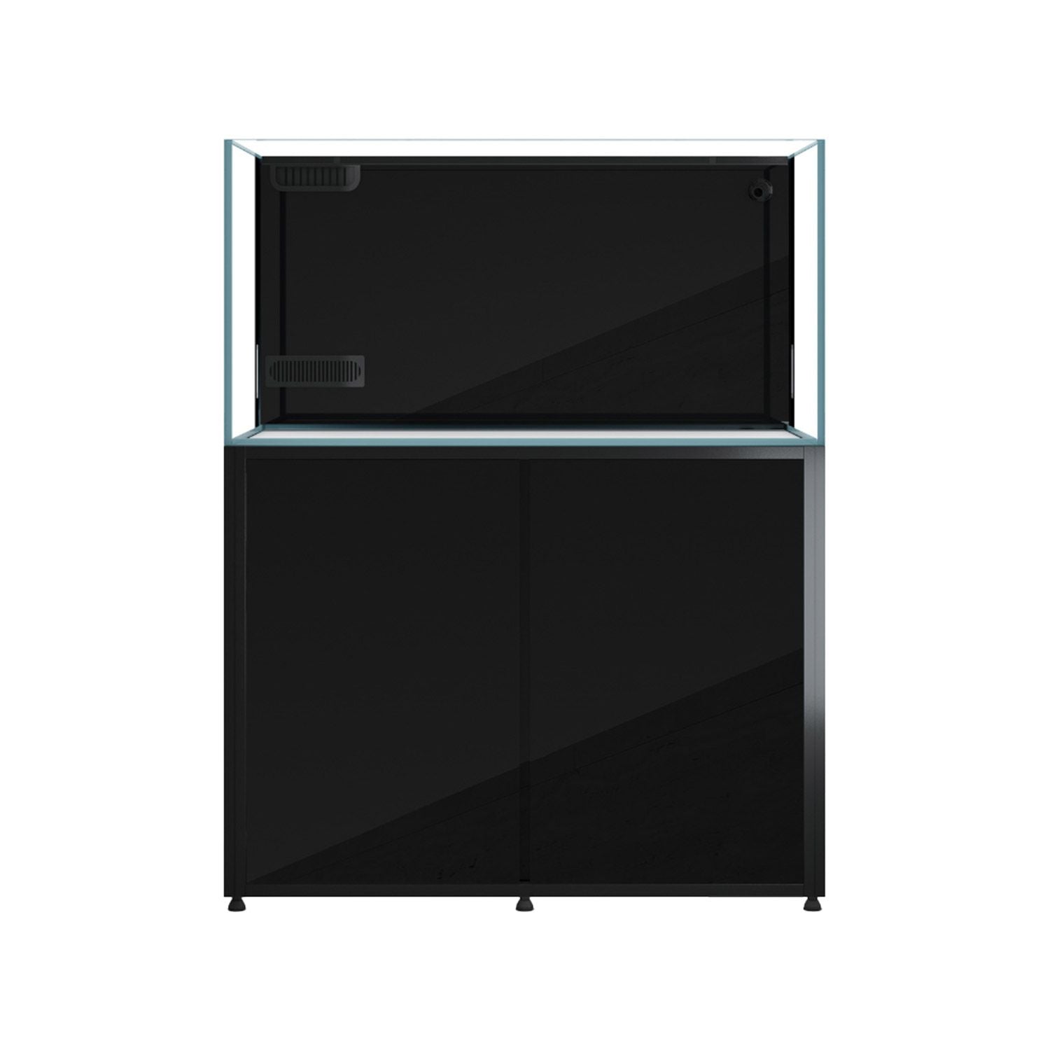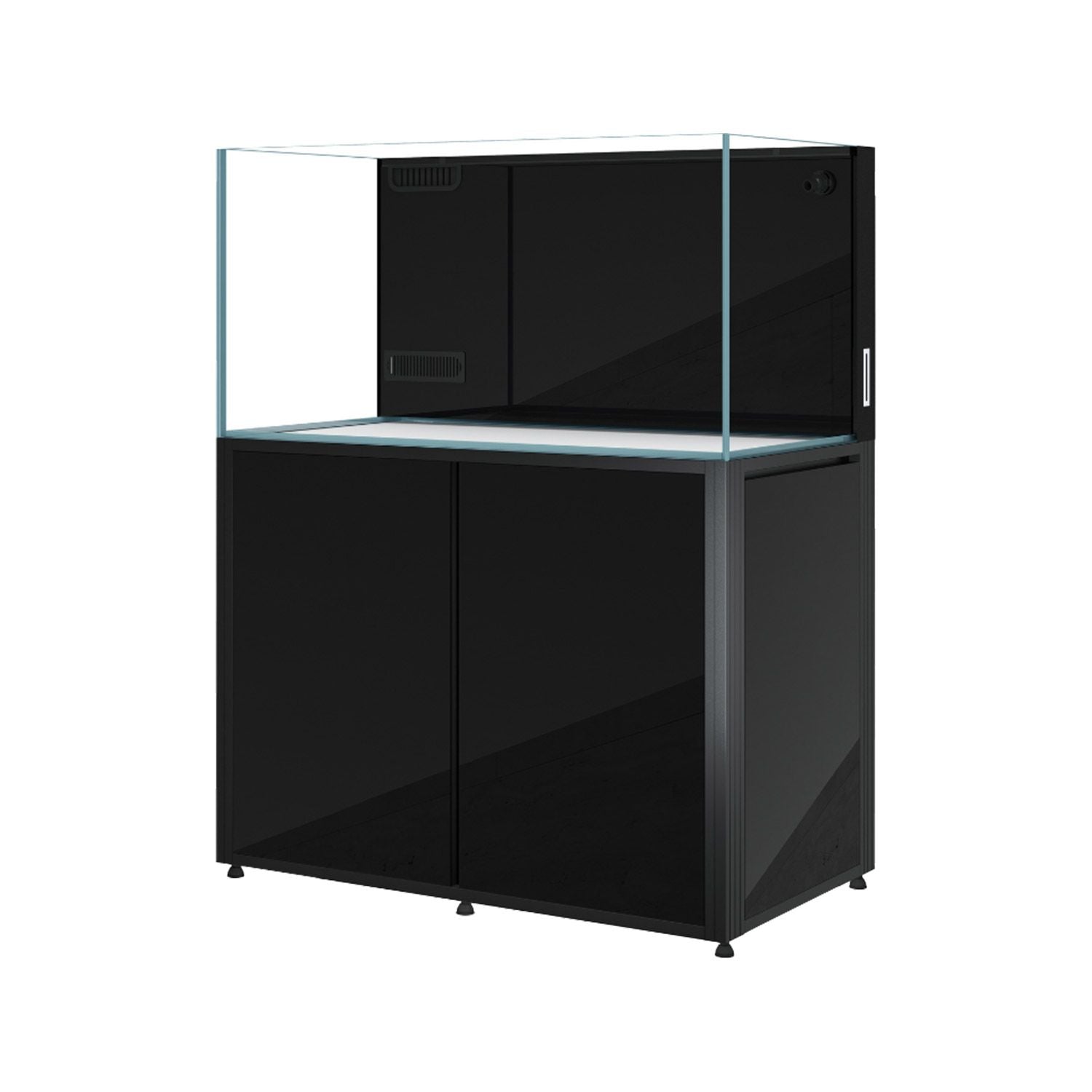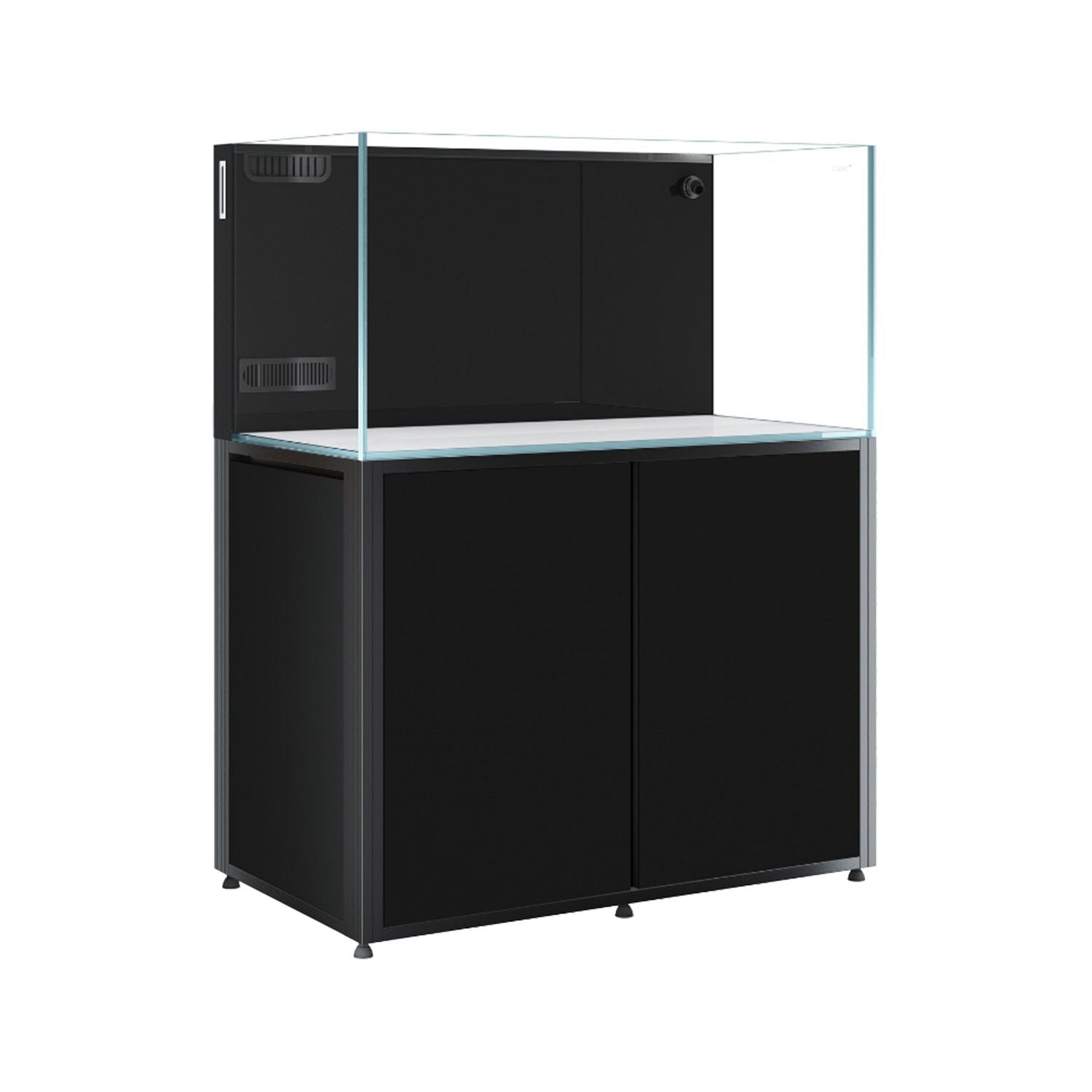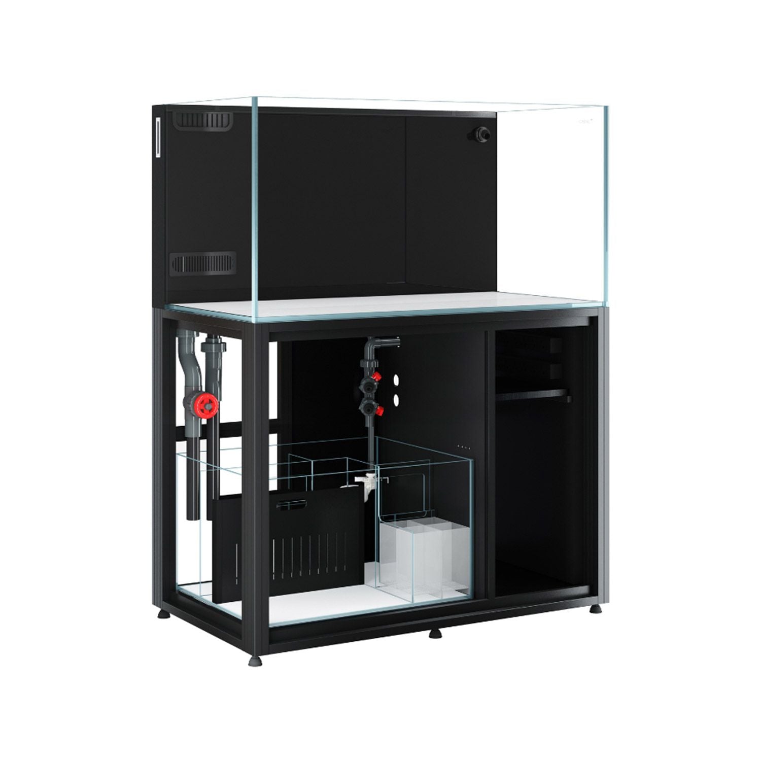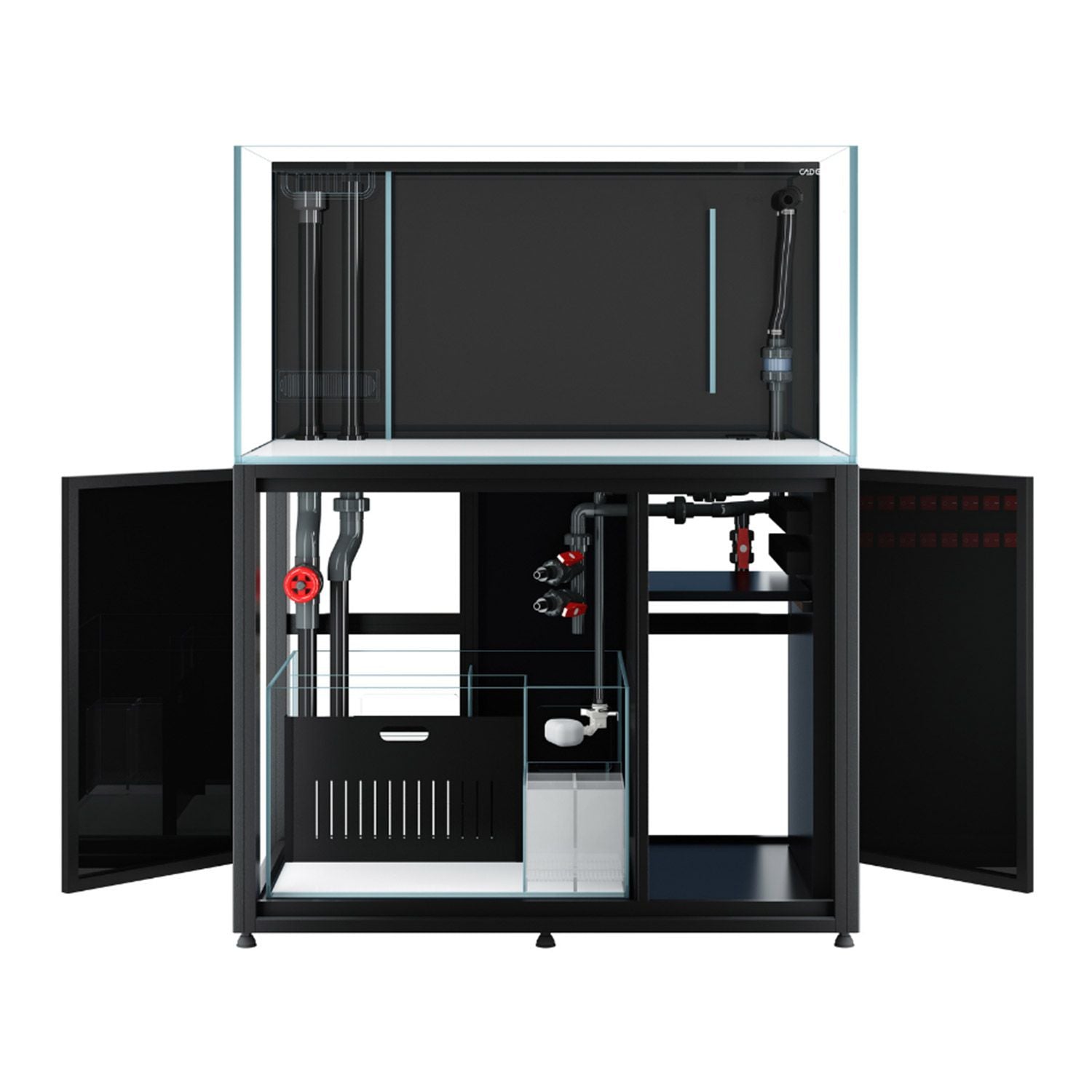 Cade Aquariums are designed by aquarists for aquarists to provide the perfect foundation for the reef tank of your dreams. A stunning setup begins with the Cade Reef S2 1200 Aquarium, and the highest quality Opti-clear glass, clean lines with transparent German Whacker silicone on flat polished edges for a crystal-clear view. The double laminated back rear glass panel neatly conceals the Silent Twin Intake Slimline Weir, ATO reservoir and aquarium plumbing. The Silent Twin Intake Weir allows for efficient uptake of debris at all levels, and in the event either intake become blocked, acts as an emergency intake. Reef S2 filtration system eliminates salt spray for silent, splash free operation. Built in media baskets store biological and bio-chemical media and are easy to access. The filtration system also includes filter sock mechanical filtration, a micro algae chamber, large protein skimmer, reactor chambers and reactor water tap feeds. Additional features include gate valve for easy water level control; high-quality jump net top; built in gravity-fed ATO and ATO reservoir water level indicator. All of these features combine for a true "All in One" Aquarium. The sturdy aluminum frame that opens on 3 sides for complete access to your setup, is the ultimate base for your Reef S2 Aquarium. Cabinets are waterproof, corrosion proof, and include industrial levelling feet. Open the high-quality cabinet doors to discover a dry area for cable management, a shelf for dosing pump, and dry goods storage. This dry area is also ideal, and ventilated for a Chiller if you require one, and even features a Chiller tap water feed. The pre-drilled dosing line holes make it easy to feed to sump. Easy side door access to control panel and power management, including several outlets for your convenience. Includes pre-fitted tank mat and features hidden internal magnetic door closers and quick release removable doors.