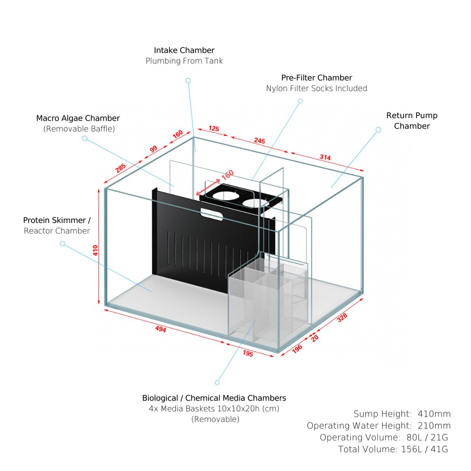 | Sump Operating Volume | 80L/21 gal |